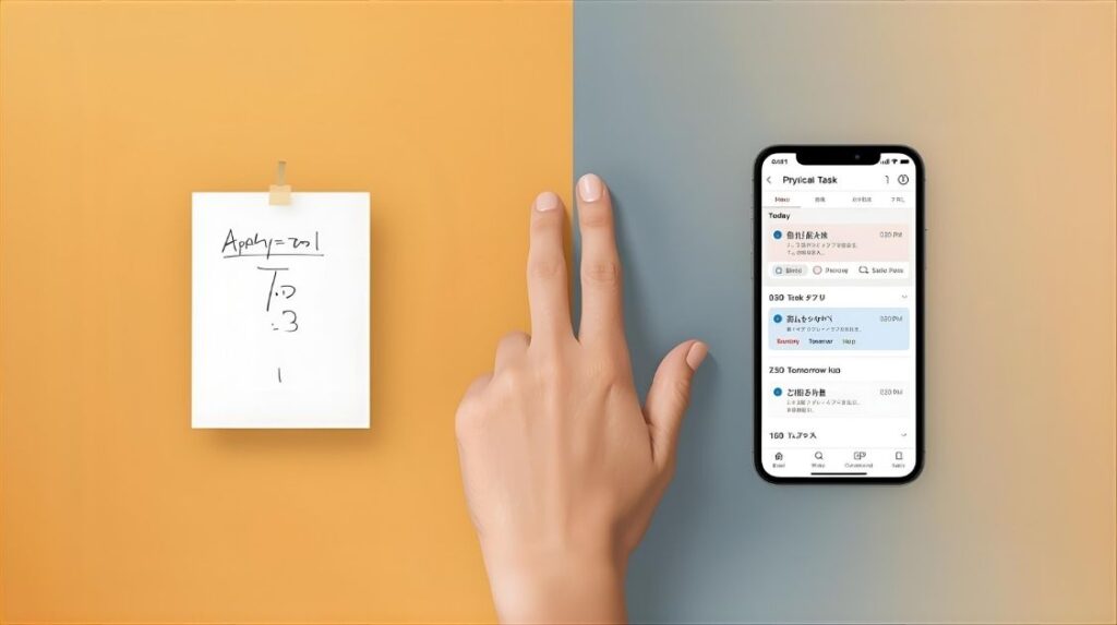 - デジタル派:1つのアプリに“今日”ラベルで追記→翌朝は“明日”ビューから開始。