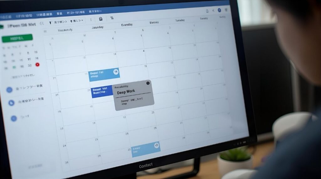 - 退社前に90分ブロックをカレンダーに予約(予定名: