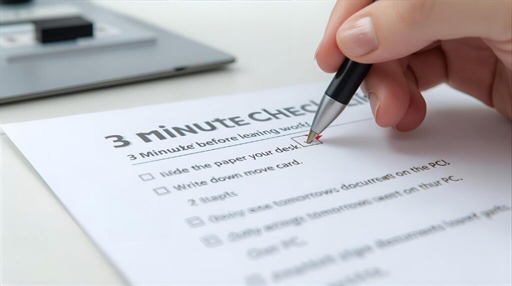 退社前の3分は、翌朝の集中を前倒しする投資。美しさより“走り出し”を最優先に、