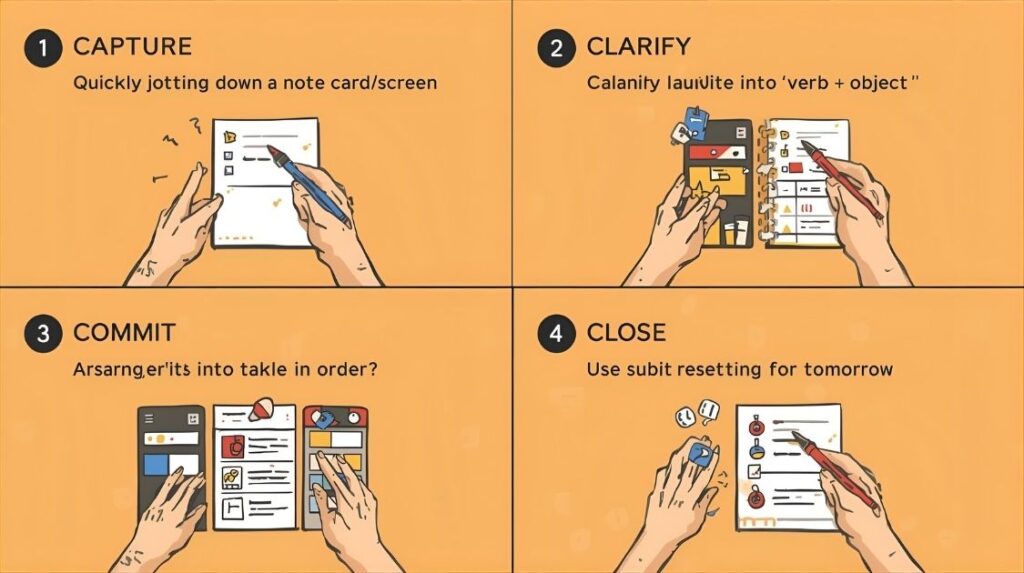 ここでは、紙派・デジタル派のどちらでも機能する“1枚(1画面)運用”を、CAPTURE→CLARIFY→COMMIT→CLOSEの4ステップで定着させます。