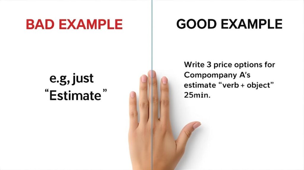 - 良い例:「A社見積りの金額案を3パターン書く(25分)」「11/4会議の議題を3つ箇条書きにする(10分)」