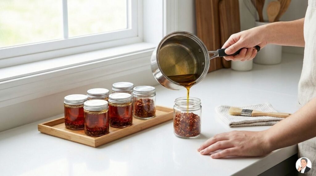 自家製チリ油を、家で無理なく作る基本をやさしく解説。少量で作るコツ、香りを作る手順、匂いと散らかりを減らす導線、小分け保存とラベルまでまとめました。初めてでも回る型が分かります。