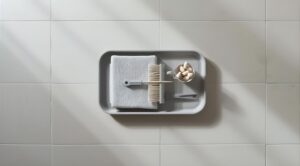 - 手すりや物干し下にS字フックで布やブラシを吊るし、トレーは薄型で足元へ
