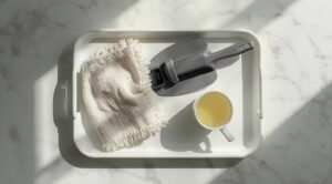 - 浅いトレーを角に置き、上に布・綿棒・紙片・小物カップをまとめる