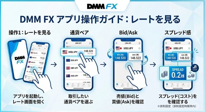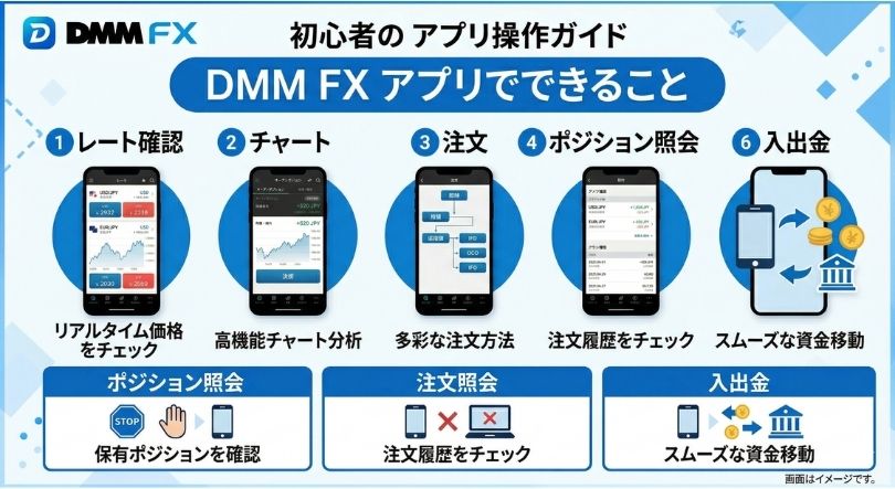 公式ページとクイックガイドでは、スマホアプリで次の操作ができる流れになっています。 (DMM FX)