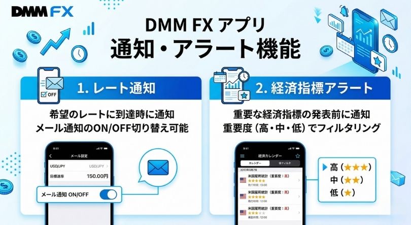 操作マニュアル(PDF)には、レートアラートメールの送信ON/OFF や、経済指標アラート設定の記載があります。 (DMM FX)