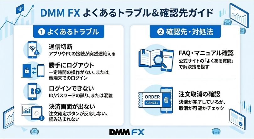 同じFAQで、通信状況が不安定な可能性もあるため、バックグラウンドアプリを閉じたり、安定した環境で試す案内があります。 (DMM FX)