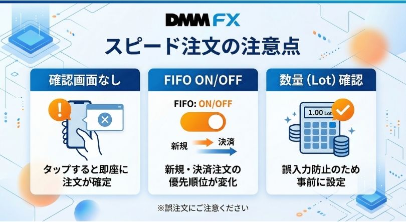スピード注文は確認画面が表示されないと明記されています。 (DMM FX)
