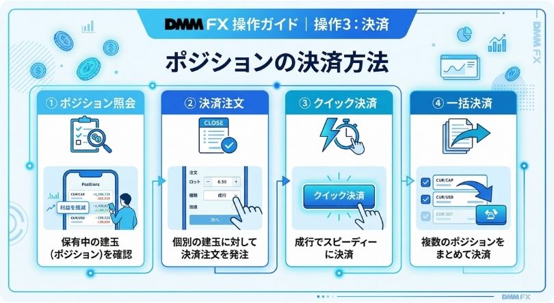 クイックガイドでは、決済注文の流れが手順で説明されています。 (DMM FX)