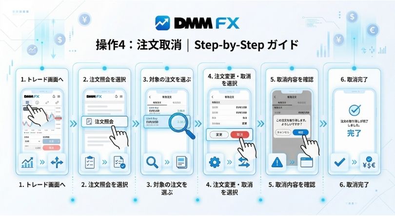 - [注文変更・取消] → [取消確認] → [注文取消] (DMM FX)