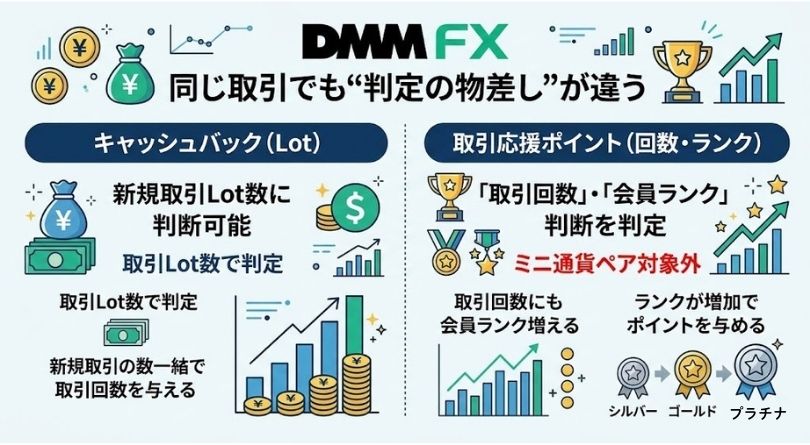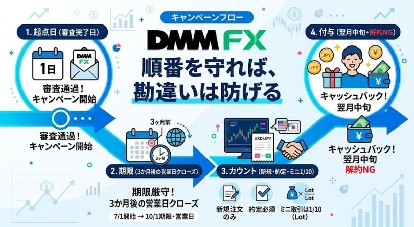 特にキャッシュバックは、公式ページ上で 審査完了日を起点に、一定期間内の“新規取引数量(Lot)”で判定する流れが明確に案内されています。(DMM FX)
