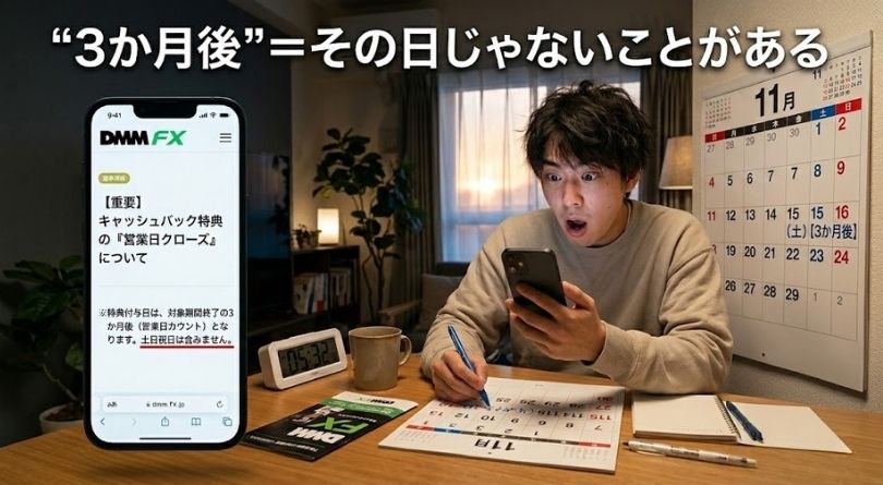 でも公式の説明は「3か月後の営業日クローズまで」で、休業日なら前倒しにもなり得ます。(DMM FX)