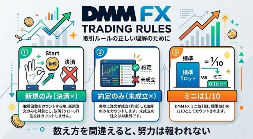 FAQでも「新規取引のみが対象」「決済はカウントされない」と明記されています。(DMM FX)