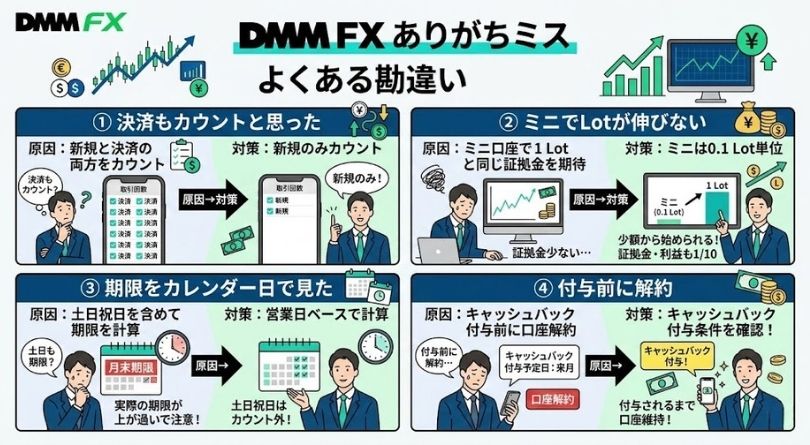 - 対策:キャッシュバックは 新規取引のみ と割り切って数える (DMM FX)