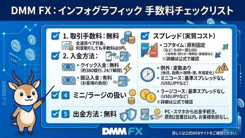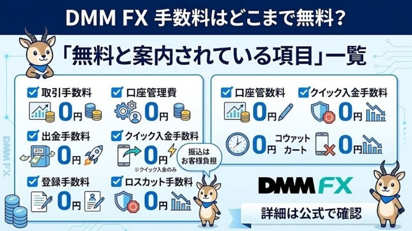 → サービス概要では「入金:お客様負担 / 出金:無料」、クイック入金は当社負担とあります。 (DMM FX)