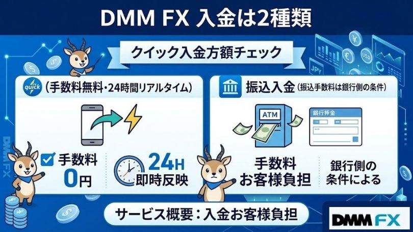 - 入金は「お客様負担」の記載があり、クイック入金は当社負担と整理されている。 (DMM FX)