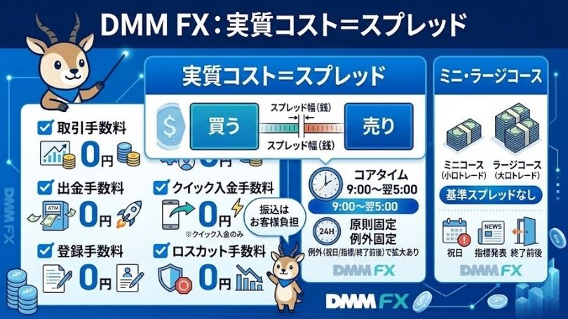 → 実質コストとしてスプレッドがある、という説明が公式にあります。 (DMM FX)