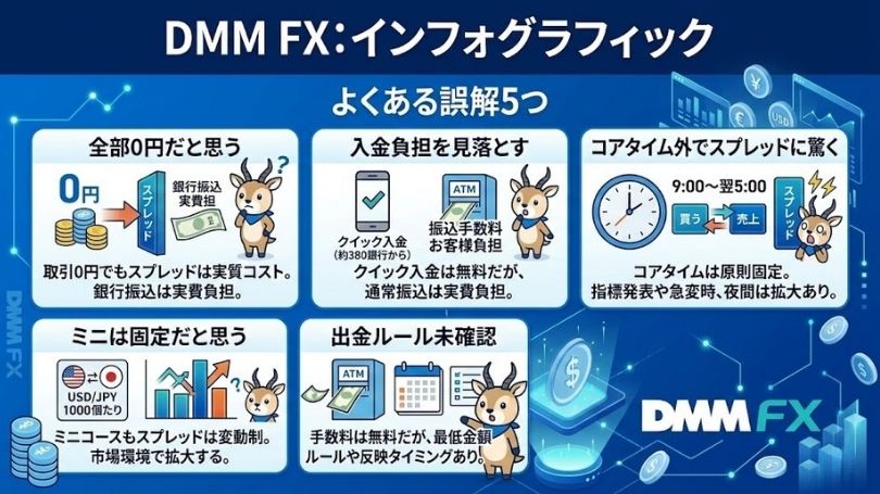 - ただし、取引コストはスプレッドが中心で、コアタイムや例外、ミニ/ラージの扱いも確認が必要。 (DMM FX)
