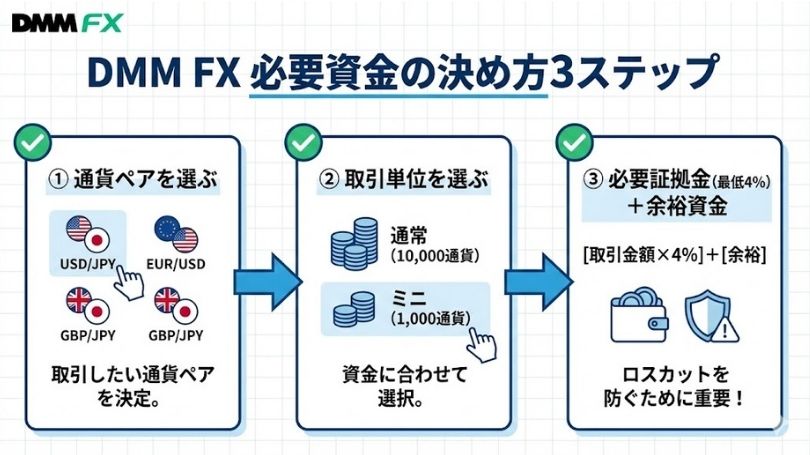 - ただし入金額は、維持率(100%/50%)も理解して“余裕”を持たせると焦りにくい(DMM FX)