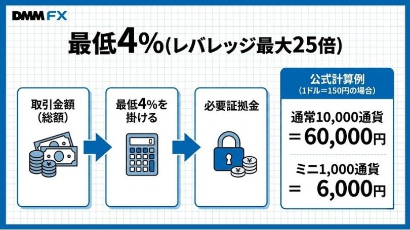 DMM FXのFAQ(追加証拠金の判定に関するページ)で、必要証拠金は取引額に対して最低4%以上と説明されています。(DMM FX)