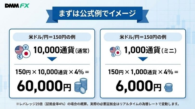 - 必要証拠金(目安)=取引金額×4%(最低4%の考え方)(DMM FX)