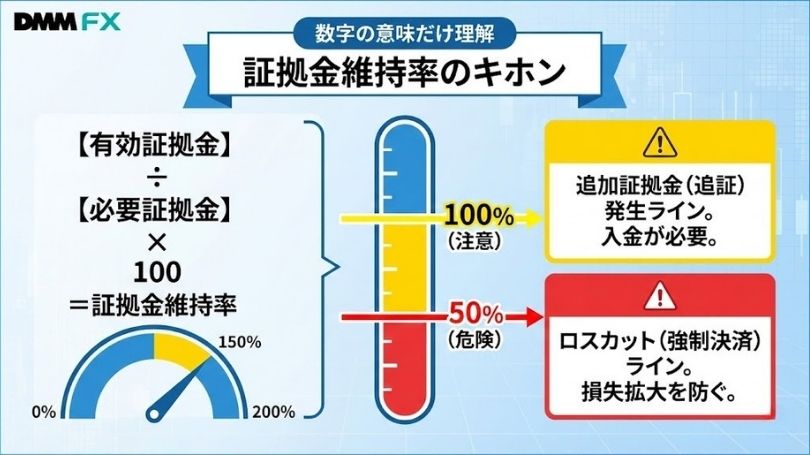 維持率は100%・50%というラインが公式FAQで説明されています。(DMM FX)