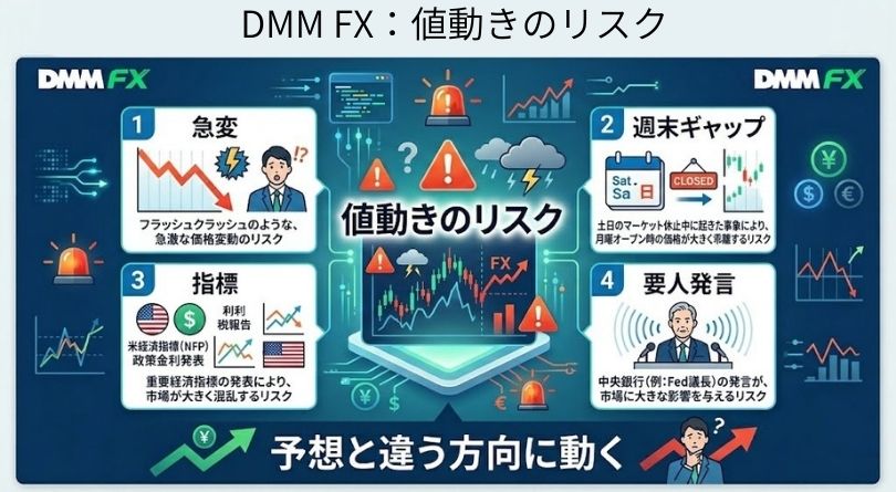 - 値動きのリスク:予想と反対に動く、週末をまたいで急に飛ぶ(ギャップ)など (DMM FX)