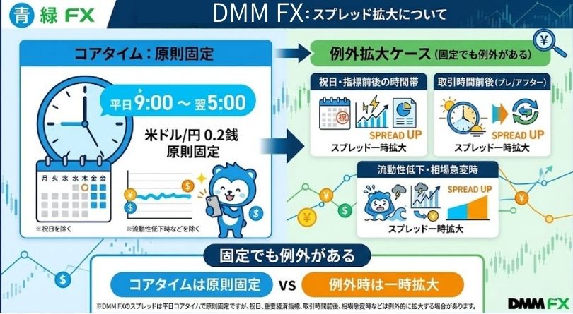 スプレッドはコアタイム原則固定でも、祝日・取引時間前後・指標発表などで拡大する可能性がある、とFAQに明記されています。 (DMM FX)