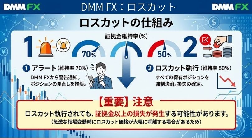 DMM FXの初心者向けガイドでは、損失の拡大によって 証拠金維持率が50%以下になるとロスカットが執行されると説明されています。(DMM FX)