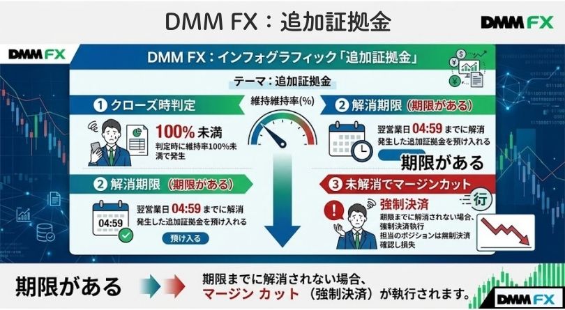DMM FXの公式説明では、毎営業日クローズ時点に証拠金維持率の判定を行い、その時点で 100%を下回ると追加証拠金が発生するとされています。 (DMM FX)