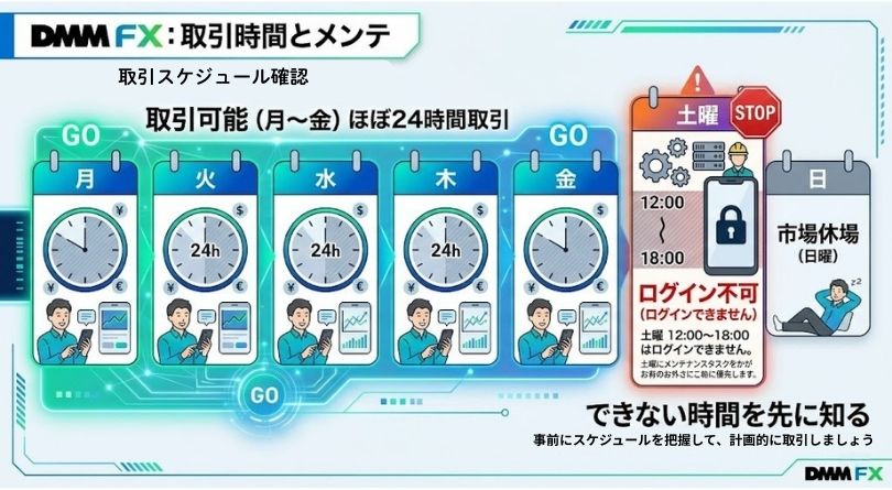 取引時間ページでは、各曜日の取引時間と、土曜12:00〜18:00がシステムメンテナンスであることが掲載されています。 (DMM FX)