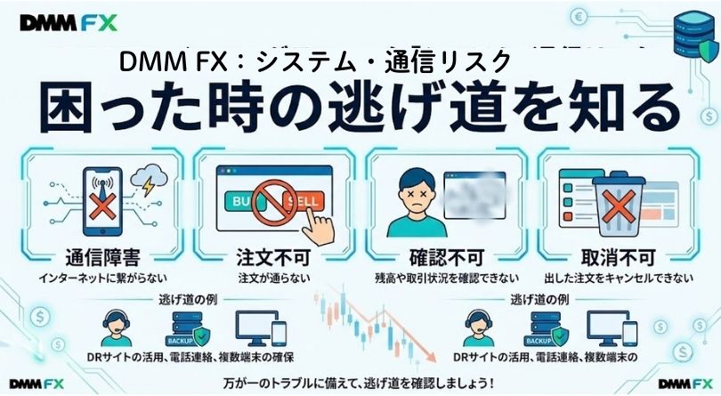 重要事項の説明では、システム不具合(通信回線、機器、コンピュータなど)により、一定期間「注文の発注・執行・確認・取消」などが行えない可能性がある、と記載されています。 (DMM FX)