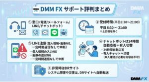 また、サービス概要にも「メンテナンス中はログインできない」旨があります(延長する場合はお知らせで案内)。 (DMM FX)
