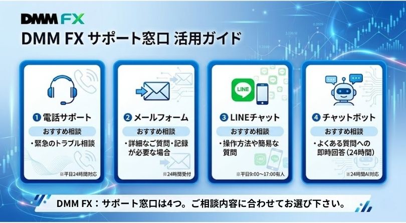 - 受付・回答時間:月曜〜金曜 08:30〜21:00(休業日は休止) (DMM FX)