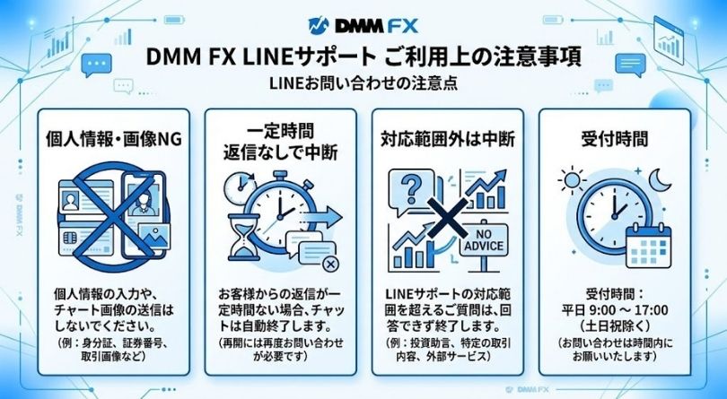 - LINEは個人情報・画像の提出が不可、一定条件で回答中断の可能性 (DMM FX)