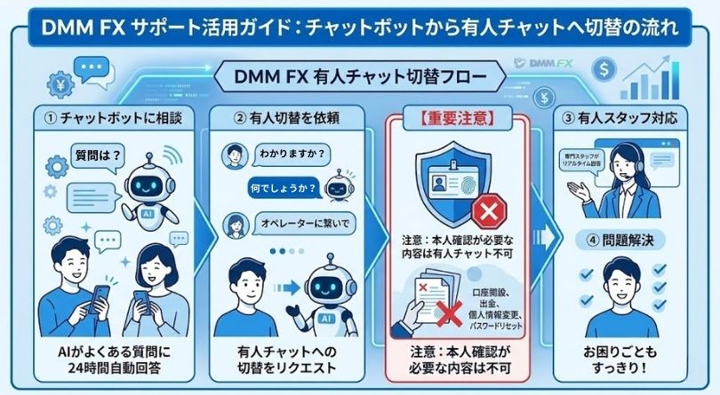 - チャットボット→有人切替あり。ただし本人確認が必要な内容は有人でも不可の場合あり (DMM FX)