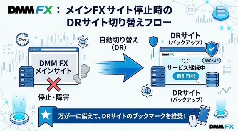 その場合に備えて、DRサイト(バックアップサイト)のURLを事前にブックマークするよう案内されています。 (DMM FX)