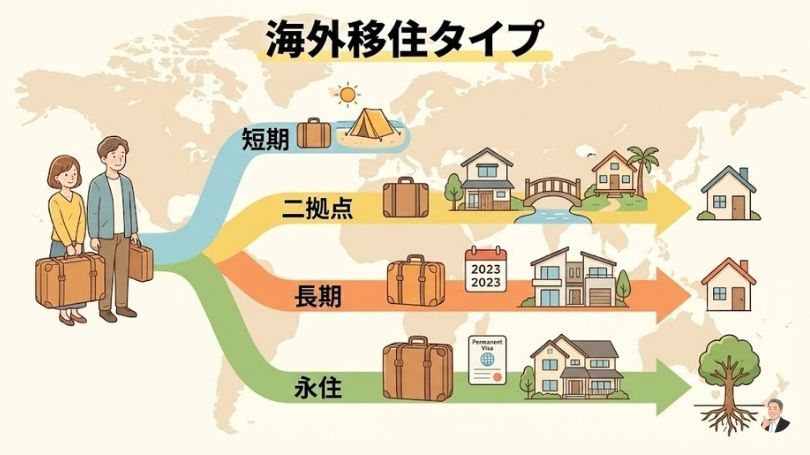 同じ「海外移住」でも形はさまざま。先にタイプが決まると、必要な手続き・お金・滞在資格(ビザ)が整理されます。