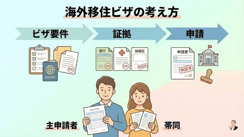 海外移住は「目的→国→滞在資格(ビザ)→お金→生活立ち上げ」の順で進めると、夫婦で揉めにくく、失敗を減らせます。
