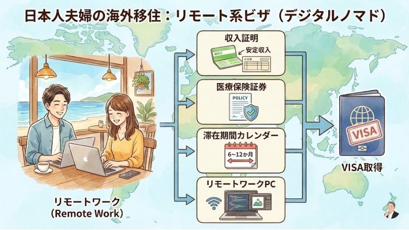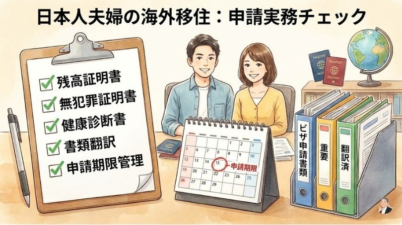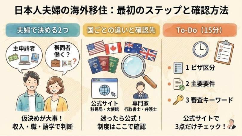 この記事の結論:ビザ(滞在資格)は「要件→証拠→手順」で分解し、夫婦の働き方に合う“現実的なルート”を2〜3本に絞る。すると、国選びも準備も一気に進みます。